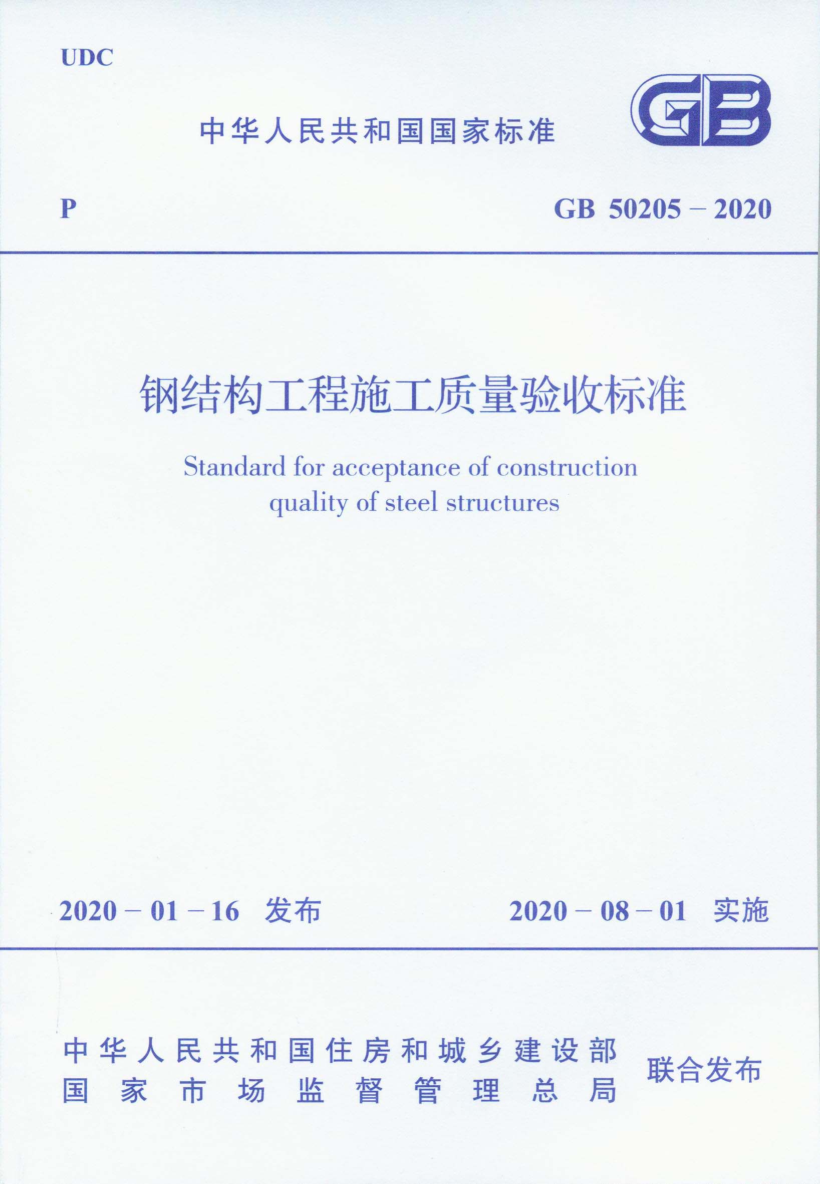 主编单位:中冶建筑研究总院有限公司、中建八局第二建设有限公司 批准部门:中华人民共和国住房和城乡建设部 中心参编人员:马德志 主要内容:《钢结构工程施工质量验收标准》GB 50205-2020共分为14章和9个附录,主要技术内容是:总则,术语和符号,基本规定,原材料及成品验收,焊接工程,紧固件连接工程,钢零件及钢部件加工,钢构件组装工程,钢构件预拼装工程,单层、多高层钢结构安装工程,空间结构安装工程,压型金属板工程,涂装工程和钢结构分部竣工验收等。