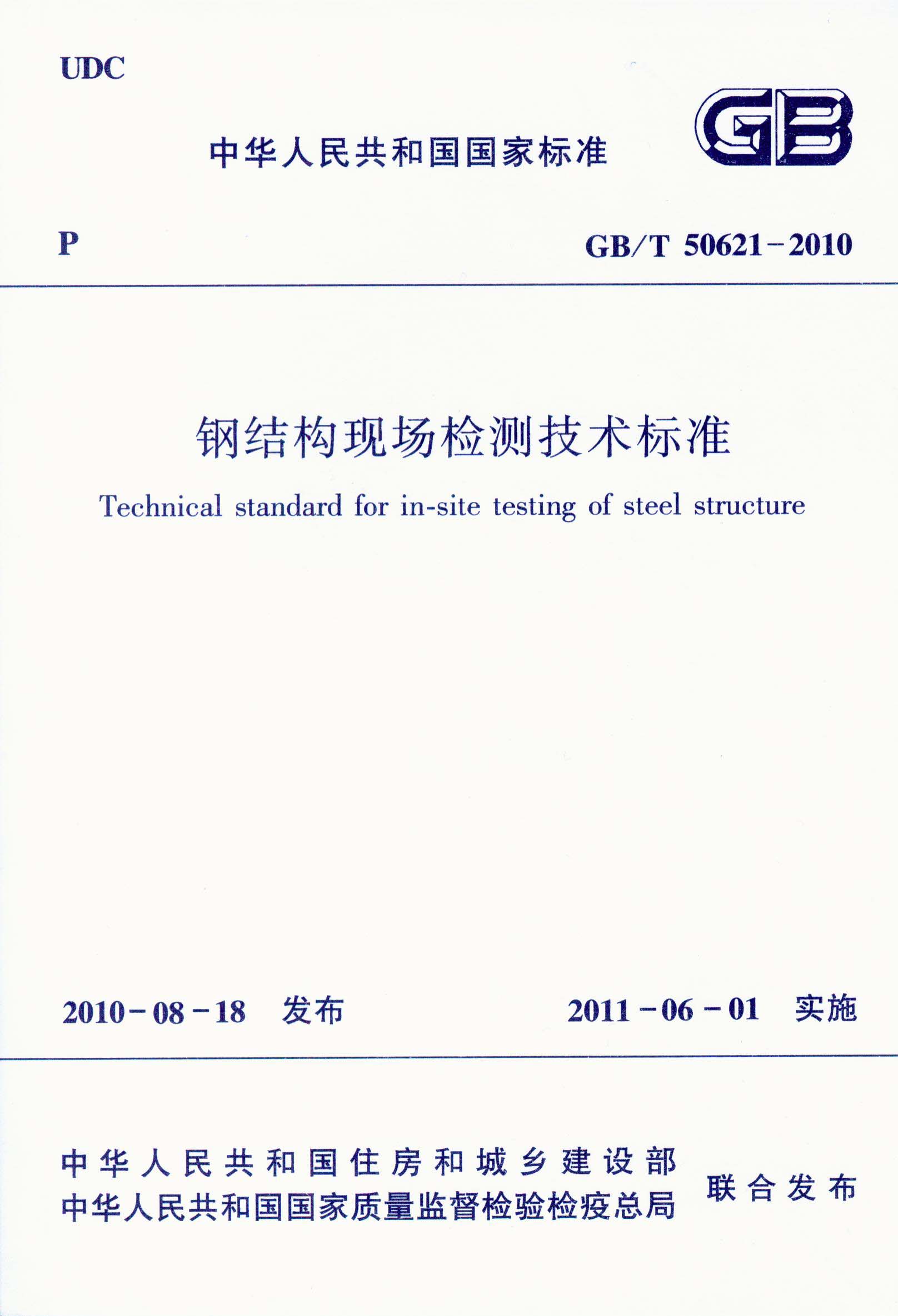 主要内容:《钢结构现场检测技术标准》GB/T 50621-2010共分14章和4个附录,主要技术内容包括:总则、术语和符号、基本规定、外观质量检测、表面质量的磁粉检测、表面质量的渗透检测、内部缺陷的超声波检测、高强度螺栓终拧扭矩检测、变形检测、钢材厚度检测、钢材品种检测、防腐涂层厚度检测、防火涂层厚度检测、钢结构动力特性检测。适用于钢结构中有关连接、变形、钢材厚度、钢材品种、涂装厚度、动力特性等的现场检测及检测结果的评价。