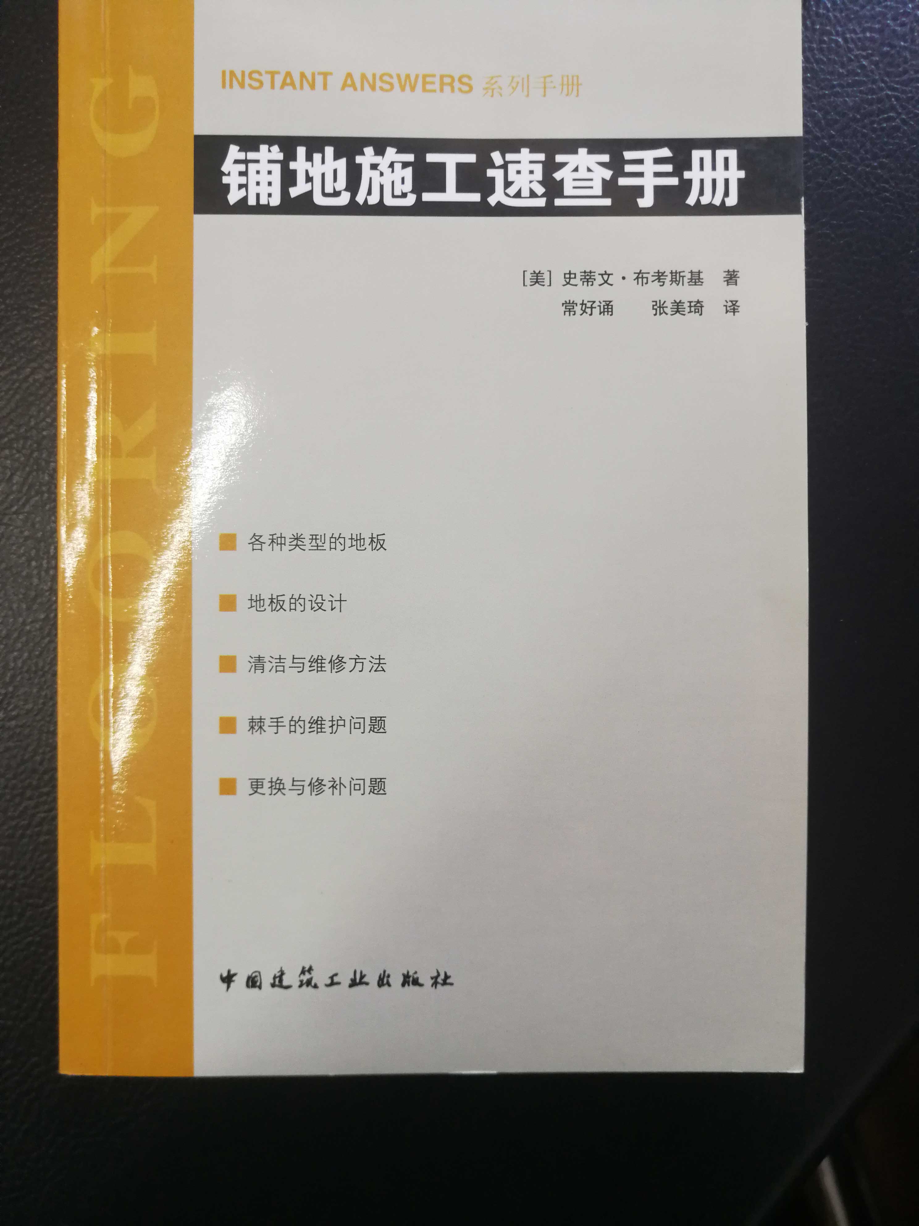 著作名称:《铺地施工速查手册》 主要编写人:常好诵、张美琦 内容简介:本书作者根据多年积累的丰富的铺地施工经验,详细介绍了铺地施工的操作要点、技巧和诀窍,内容涉及非常广泛,包括地毯、复合地板、软木地板、硬木地板、瓷砖地面、弹性乙烯地板、竹地板以及转地面的铺设,此外,书中还介绍了清洁、维护和修补地毯、复合地板等的方法,以及工地安全和急救方面的常识,可以说是铺地施工的一本“百科全书”。本书查找信息非常方便,而且便于携带。 本书适用于建筑施工技术人员,建筑技术工人。