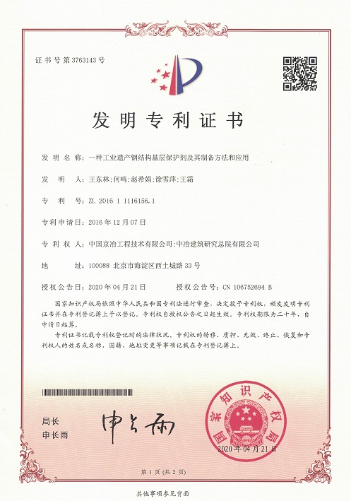 发 明 摘 要:本发明涉及一种工业遗产钢结构面层保护剂及其制备方法和应用,属于工业遗产钢结构保护领域。包括有按重量百分比计的如下组分:塑性树脂液27~41%、分散剂15~25%、渗透剂4~18%、抗紫外线老化剂5~10%、成膜助剂13~30%、活性溶剂9~35%。本剂具有很好的耐候性、耐晒、耐水、并且消光性极佳。实施后,保护性能高、不反光、不刺眼。本品用于工业遗址保护与开发、钢材表面保护。通过渗透、封固结构件的缝隙、接头、拼接部位以及因旧锈层和旧涂层引起的应力变化,来提高保证涂层的附着力,延长维护系统的使用寿命。