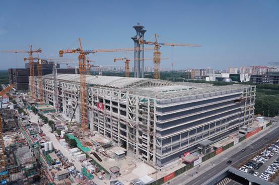 国家会议中心二期项目是2022年北京冬奥会主新闻中心和国际广播中心,位于北京奥林匹克中心区,东临天辰东路,西临天辰西路,南抵大屯路隧道,大屯北路下穿建筑主体。建设用地面积9.3万平方米,总建筑面积约41万平方米,地上三层,地下二层,地上平面尺寸约为456×144米,建筑檐口高度45米,其主体工程以钢结构为主,总用钢量达到12.6万吨。预计到8月31日,工程主体结构实现封顶,2021年7月交付北京冬奥组委使用。