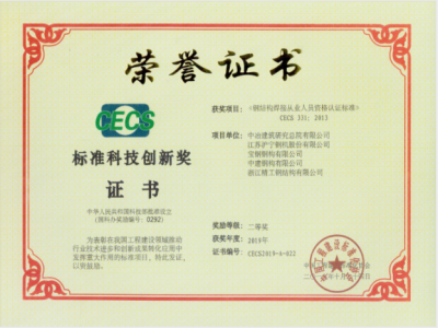 获奖项目:《钢结构焊接从业人员资格认证标准》CECS 331:2013