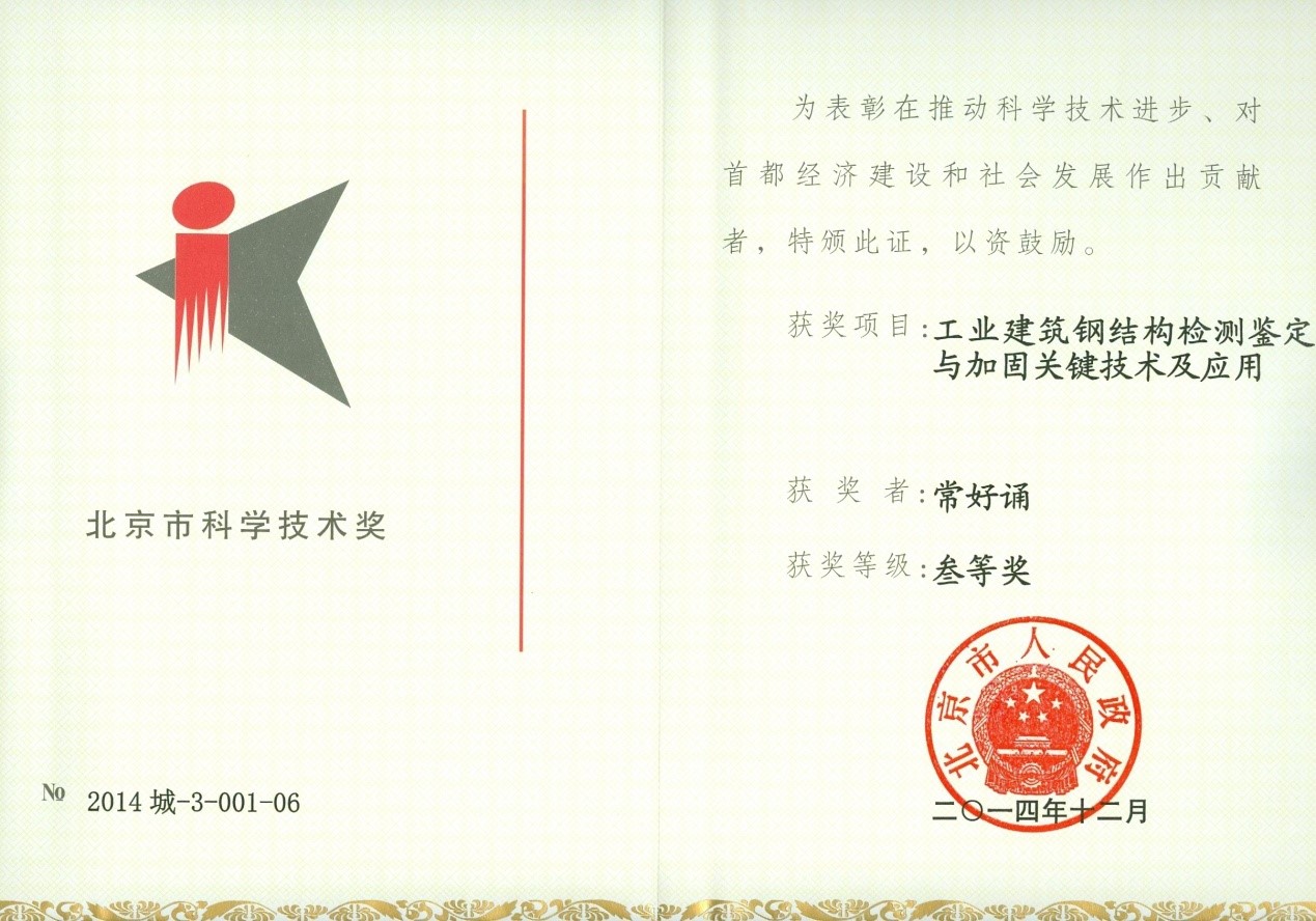 奖项年份、名称、等级:2013年中冶集团科学技术二等奖、2014年北京市科学技术进步奖三等奖